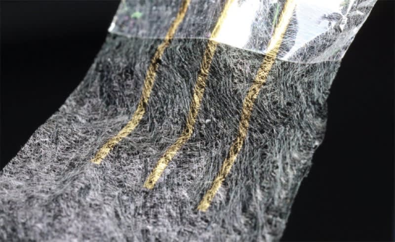 To make the sensors, first a process called electrospinning extrudes ultrafine polyurethane strands into a flat sheet, similar to how some common 3D printers work. This spiderweb-like sheet is then coated in parylene, a type of plastic, to strengthen it. The parylene on certain sections of the mesh is removed by a dry etching process with a stencil. Gold is then applied to these areas to make the sensor probes and communication wires. Additional parylene isolates the probes so that their signals do not interfere with one another.