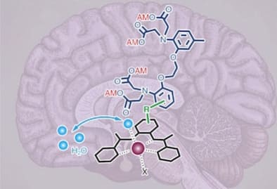 Once inside the cell, if calcium levels are low, the calcium chelator binds weakly to the manganese atom, shielding the manganese from MRI detection. When calcium flows into the cell, the chelator binds to the calcium and releases the manganese, which makes the contrast agent appear brighter in an MRI image.