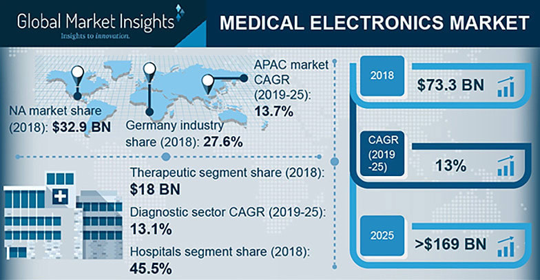 The medical mlectronics market is set to grow from its current market value of more than $73.3 billion to over $169 billion by 2025; as reported in the latest study by Global Market Insights, Inc .