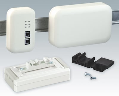 Two new adaptors are available from OKW Enclosures, Bridgeville, PA, that enable any small plastic enclosure to be mounted on a DIN rail — saving space and speeding up installations. The adaptors are suitable for a range of electronics applications including automation, Industry 4.0/smart factory, and electronics modules. B6811751 is designed to fit TH35, TH15, and G32 DIN rails. It can be screwed to the back of the enclosure (wall thickness 3 mm) using two screws (supplied) and then located on the rail. The adaptor is molded from PA 66 (UL 94 V-0) in black (RAL 9005) as standard. B1300017 (off-white) or B1300019 (black) fits TH35 and G32 rails.