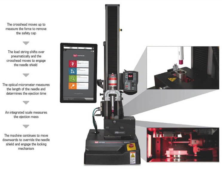 When developing and mass producing these devices, manufacturers usually perform a combination of testing to government-regulated standards and internal quality testing to ensure efficacy of the device. Internal quality testing is often necessary because the international standards committees cannot always amend testing standards as quickly as the device technology evolves. The most widely used international standard is ISO 11608-5, which discusses the test methods and requirements for automated needle-based injection devices. Within the standard, the functionality of the device is evaluated from both an ergonomic and an operational perspective. A universal testing machine is the ideal device for measuring and capturing the following results.