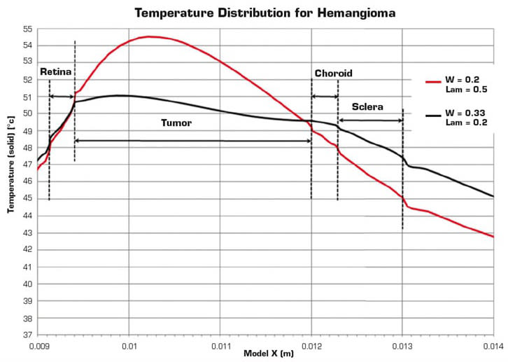 By using FloEFD, the team was able to simulate the laser effect on different types of intraocular tumors and to evaluate the radiation power increase required for treatment correctly. The experiment using numerical modeling for an organ-preserving method of treatment of choroid tumors with laser thermotherapy with a wavelength of 810 nm showed the agreement of the calculated data with the results and long-term experience of treatment.