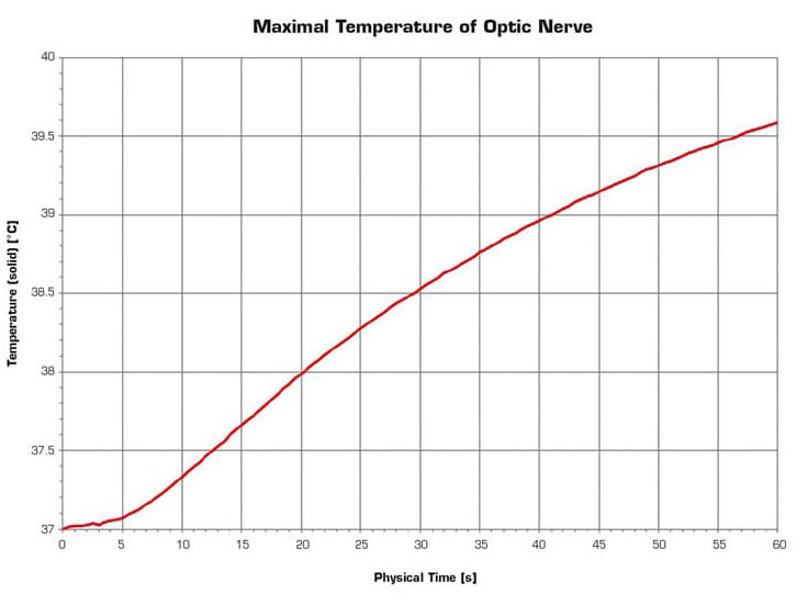 The maximum temperature achieved on the optic nerve during laser thermotherapy session is illustrated in Figure 12. The temperature on the optic nerve disk is slightly less. When the minimum distance between the optic nerve disk and the center of the spot impact is around 3 mm, the temperature of the optic nerve disk reaches values of 39.5 °C, which is not critical.