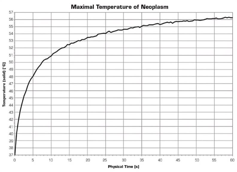 Distribution of the maximum temperature within the tumor during the laser thermotherapy session is shown in Figure 10. At the end of the exposure, the maximum temperature inside the tumor reaches ~56.2 °C.
