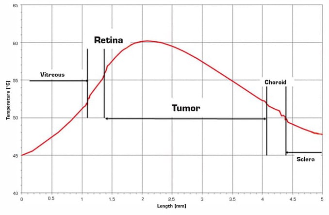 However, now it is not possible to measure physically both the temperature of the tumor and the temperature of the surrounding tissues. Numerical simulation allows us to estimate these temperature levels, as well as the temperatures of nearby eye structures, such as the retina, optic nerve, and choroid.