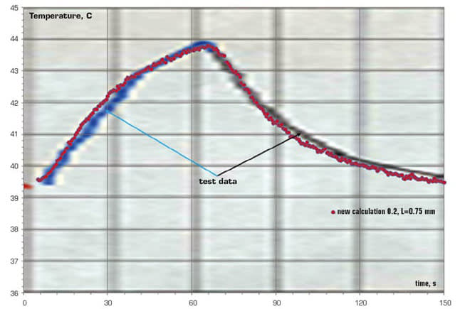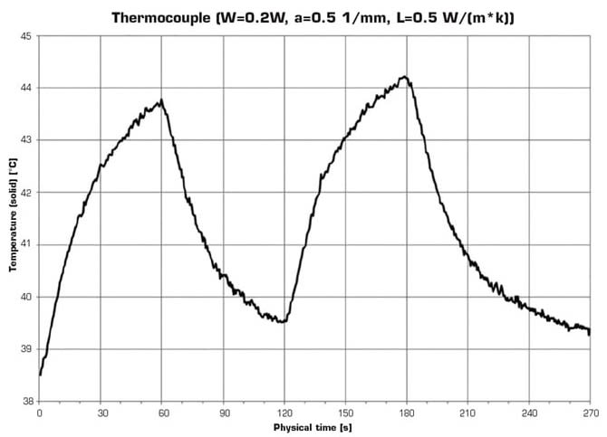 The team used real-world data of temperature measurements obtained in the treatment of patients with melanoma of choroid to qualify the numerical calculations.4 The thermal measurements were taken when the tumor was cotreated with brachytherapy and laser thermotherapy. Moreover, laser thermotherapy was performed after 24 hours of the installation of the ophthalmic plaque (14). The Type T (copper-constantan) thermocouple (15) was put on an insulating substrate (13) that was 1-mm thick. The substrate with the thermocouple was placed between the ophthalmic plaque and the sclera. A test thermocouple signal is shown in Figure 2.