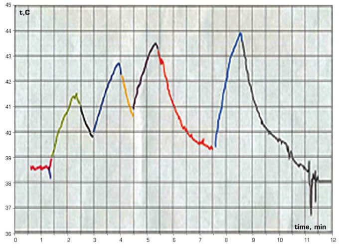 Laser thermotherapy was performed in accordance with the following procedure: firstly, the periphery of the tumor was exposed (the first three temperature peaks); and then its central part was exposed (the last temperature peak). The tumor had a thickness of 2.6 mm.