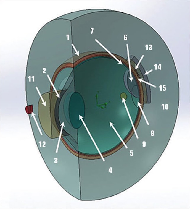The team performed numerical simulation of laser thermotherapy on a simplified model of the eye (see Figure 1), which includes its main elements. The computational model contains all the basic geometric characteristics of the eye: an eyeball bounded by a sclera (1), cornea (2), intraocular fluid (3), lens (4), vitreous (5), tumor (6), retina (7), choroid (8), optic nerve (9), and part of head tissue around eyeball (10). An additional auxiliary lens (11) was used for the treatment, and a laser radiation source (12) was included in the model to simulate a medical procedure.