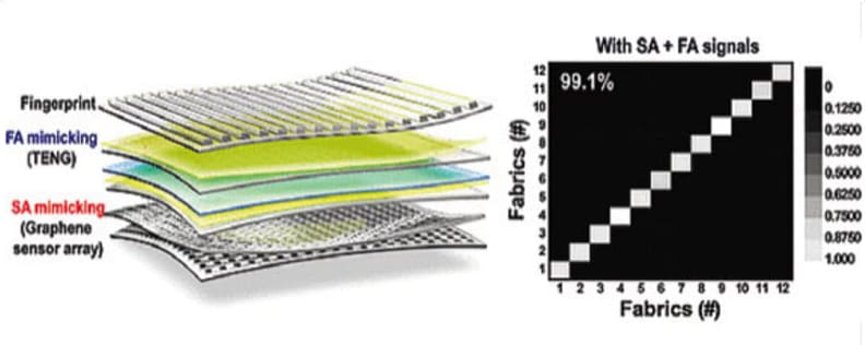 The tactile sensors are in a flexible film-form that consist of an upper panel with human fingerprint-like micro patterns, middle panel with vibrator sensor mimicking fast adaptive receptors and a low panel with a pressure sensor mimicking slow adaptive receptors. Researchers used the principle of identifying roughness by measuring the vibration of friction electrical signals that are generated through object surface, to mimic FA receptors.