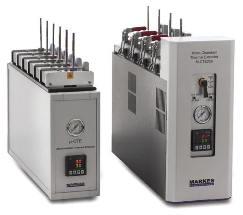To develop compliant products and routinely monitor product quality, manufacturers can implement in-house screening for convenience. Markes’ Micro-Chamber/Thermal Extractor™ (μ-CTE™) can be used to prepare samples for TD–GC–MS to enable the rapid screening of VOCs. The μ-CTE requires minimal sample preparation and is simple to operate. Samples are placed inside one of either four or six microchamber sample pots (depending on the model), and the lids are then sealed shut. A sorbent tube is attached to the outlet of each chamber, and a flow of gas (air or nitrogen) sweeps the VOCs from the samples into the sorbent tube.