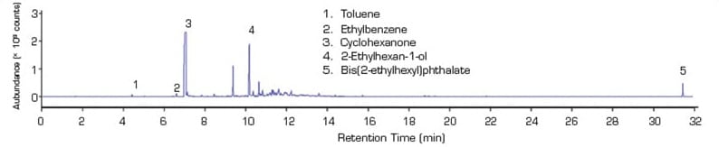 Once a sample has been taken using the μ-CTE, the sorbent tube is placed in an automated TD unit. The VOCs emitted from the sample are introduced to a GC–MS for separation and analysis. Chromatographic data is generated to identify the chemicals emitted (see Figure 5).
