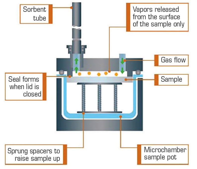 The microchamber sample pot is then placed in the μ-CTE and gas is passed over the sample. VOCs permeating the material through to the top of the sample pot can be collected periodically in sorbent tubes to determine the length of time it takes for the VOCs to pass through the material.