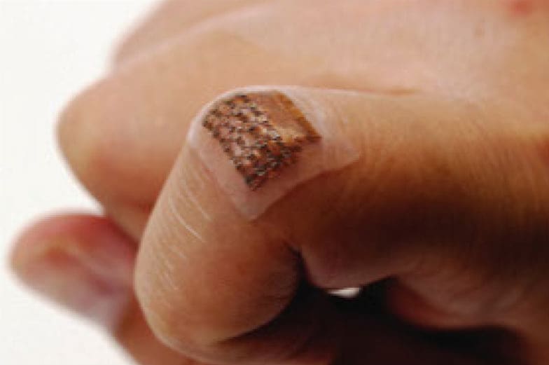 Continuous monitoring of the central blood pressure waveform from deeply embedded vessels such as the carotid artery and jugular vein has clinical value for predicting cardiovascular mortality. This ultrasonic device is conformal to the skin and capable of capturing blood pressure waveforms at deeply embedded arterial and venous sites. The wearable device is ultrathin and stretchable and enables the non-invasive, continuous, and accurate monitoring of cardiovascular events from multiple body locations, which should facilitate its use in a variety of clinical environments.