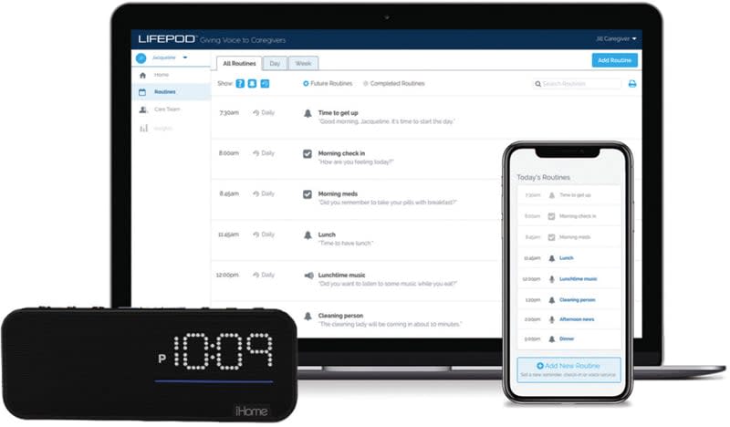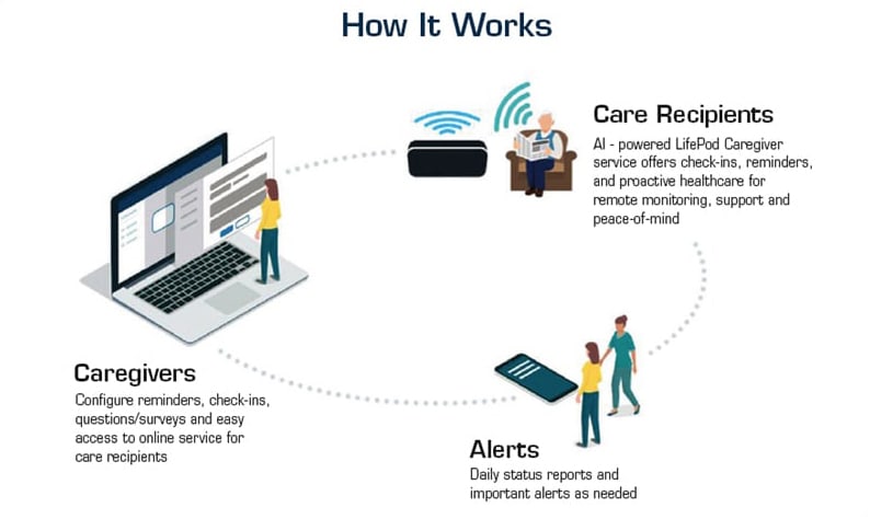 LifePod enables independent living with voice activation. The major concern of the aged who are living independently is the lack of care. With LifePod, a proactive-voice caregiving service, professional and family care-givers have access to important data about patient well-being. How does it work? The care recipients rely on voice to communicate with the device. The caregivers have access to the data 24/7 as shown in Figure 5.