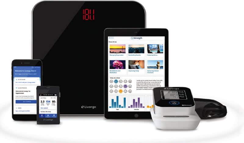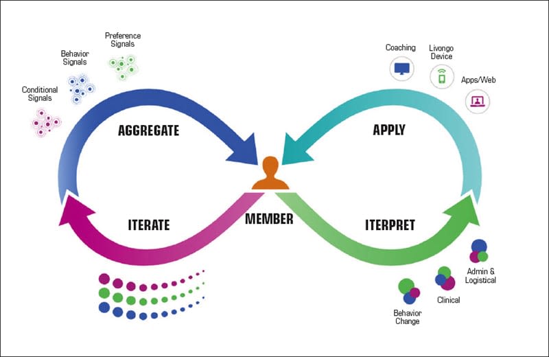 To help individuals manage health across the board, Livongo offers an integrated platform to monitor diabetes, hypertension, pre-diabetes, weight loss, and behavioral health conditions (see Figure 10). Their Aggregate, Interpret, Apply, and Iterate approach called the AI+AI is the backbone of its Applied Health Signals engine, which addresses health monitoring simplification. Taking a membership approach, Livongo uses data science and technology to track users’ health conditions to foster better clinical and financial outcomes (see Figure 11).