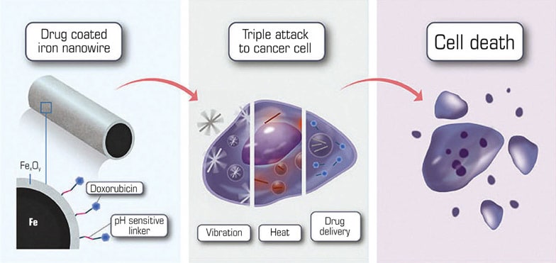 Drug-coated iron nanowires that can be guided to the site of a tumor using an external magnetic field before activating a three-step cancer-killing mechanism could provide an effective option for cancer therapy.