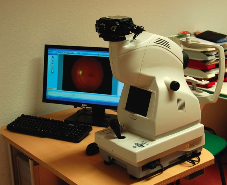 Glaucoma, diabetic retinopathy, or age-related macular degeneration (AMD) are other examples of medical conditions that could be detected much earlier if suitable technology was used beyond ophthalmological practices. Such a service could easily be offered by general practitioners as part of annual checkups, or by nursing staff in elderly care homes and home care settings, or even by opticians or pharmacists, similar to blood pressure measurement. Since there is no reliable treatment as yet for AMD, one of the most common eye diseases in the western world causing severe vision loss in people over 50, early detection would help significantly avoid risk factors.5