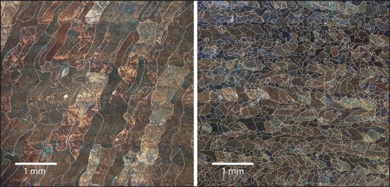 “If you look at the microscopic structure of 3D printed alloys, they’re often made up of large and elongated crystals,” Todaro explains.