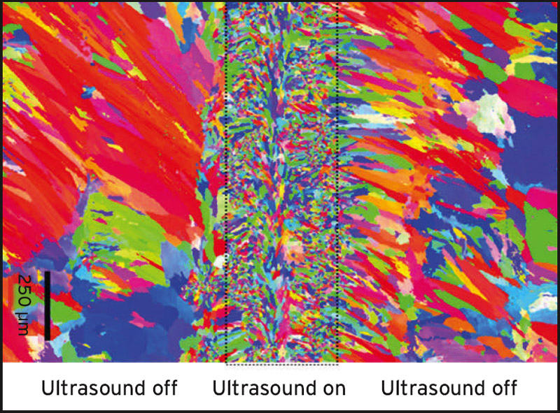 “This can make them less acceptable for engineering applications due to their lower mechanical performance and increased tendency to crack during printing,” he says. “But the microscopic structure of the alloys we applied ultrasound to during printing looked markedly different. The alloy crystals were very fine and fully equiaxed, meaning they had formed equally in all directions throughout the entire printed metal part.”