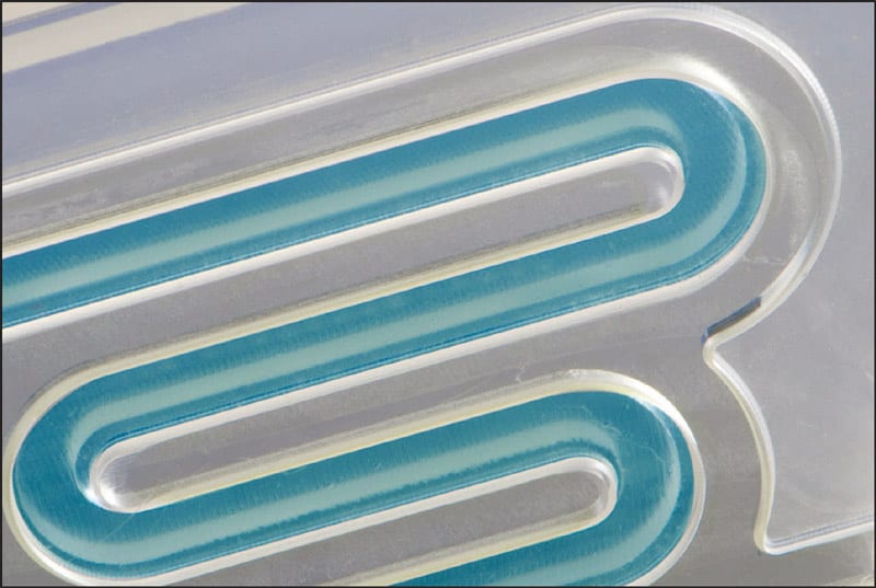 As Sono-Tek perfected the means of applying the laser-absorber, Hugh McNair, manager, laser applications and systems for Emerson Automation, led the effort to perfect the spray-enabled laser welding process. He explains, “This new clear-on-clear plastic laser welding technology can reliably produce complex fluid paths while maintaining superior aspect ratios in the submillimeter flow path pitch.” Such a degree of precision is essential for microfluidic parts, which must be reliably bonded, yet maintain consistent dimensions along extremely small flow paths.