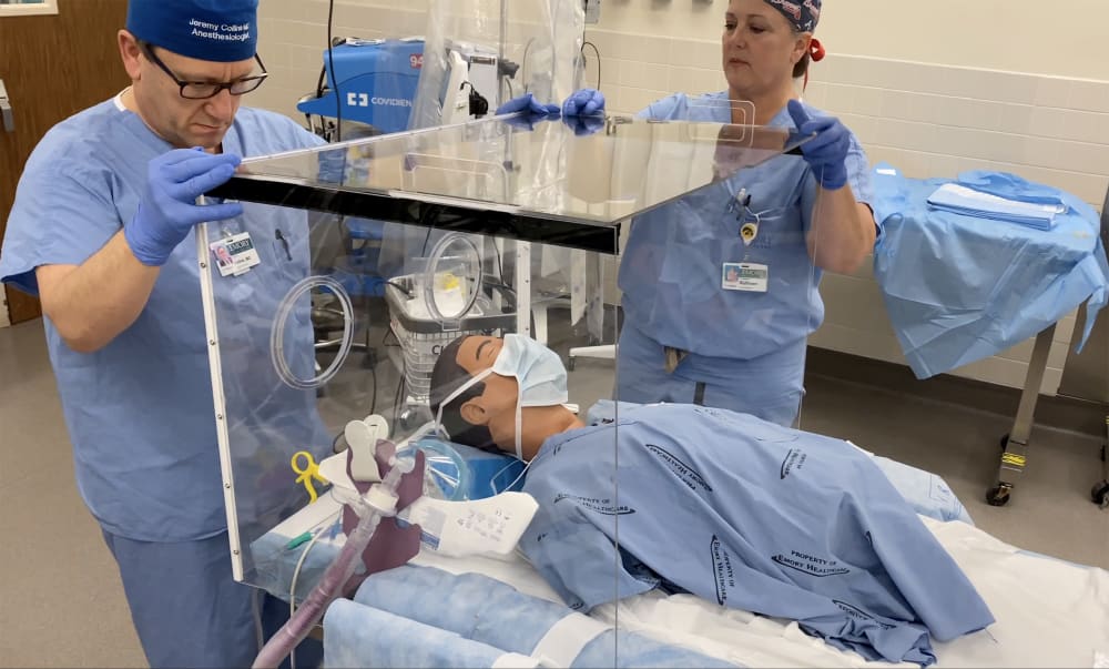 “Intubation and extubation require a physician to work in extremely close proximity to a patient while simultaneously performing procedures known to generate a large amount of potentially infectious droplets,” says Cinnamon Sullivan, M.D., assistant professor of anesthesiology, Emory University School of Medicine and the director of Global Health Anesthesiology at Emory University Hospital. “The goal of this box is to block, to a large extent, the amount of droplets being aerosolized and serve as one more layer of protection in addition to our personal protective equipment (PPE).”
