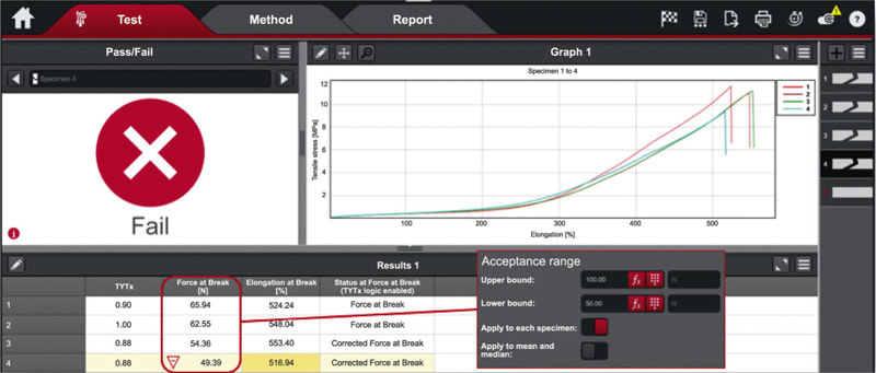 Manual data input is one of the main bottlenecks in the testing process, requiring intense focus from the test operator to correctly enter batch information, specimen tags, and test parameters. The use of barcode scanners streamlines the entire process, reducing the chance of errors. Automatic specimen measurement devices (ASMDs) allow the operator to integrate their caliper or micrometer with the system, automatically pushing the dimensions to the software and eliminating the need enter them manually. Finally and most importantly, the software uses visual indicators to help operators quickly identify batch quality issues before it can result in stop shipments, lost revenue, or inadequate PPE being released into the market.