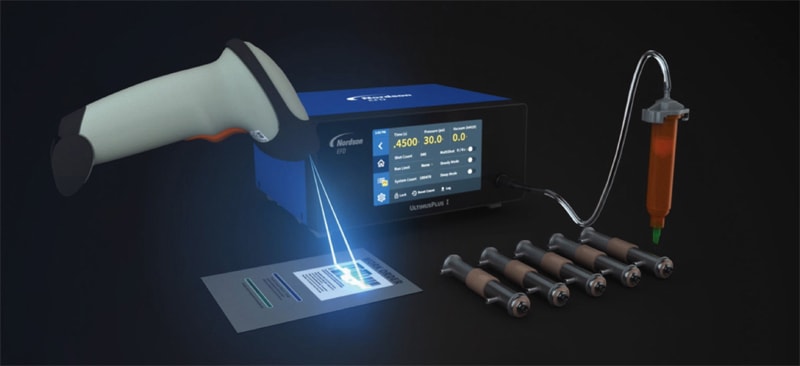 Barcode Scanning for Enhanced Process Control. Also new to the world of pneumatic benchtop fluid dispensing is the unique capability to switch between stored dispensing programs using nothing more than a barcode scanner. This allows the operator to change the parameters for a new application without touching process parameters on the screen. The dispenser settings automatically switch when the new program barcode is scanned.
