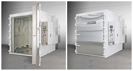 An inert atmosphere walk-in oven from Grieve, Round Lake, IL, can be used for annealing polyurethane tubing at the customer’s facility. No. 1038 is a 500 °F (260 °C) oven that measures 60 × 72 × 84 in. A 4200 CFM, 3-HP recirculating blower provides vertical downward airflow to the workload. The oven has 6 in. insulated walls and an aluminized steel exterior with a Type 304, 2B finish stainless steel interior. It also includes a pressure regulator, flow meter, pressure gauge, inner oven walls sealing directly against ½ in. thick silicone rubber door seal, and more.