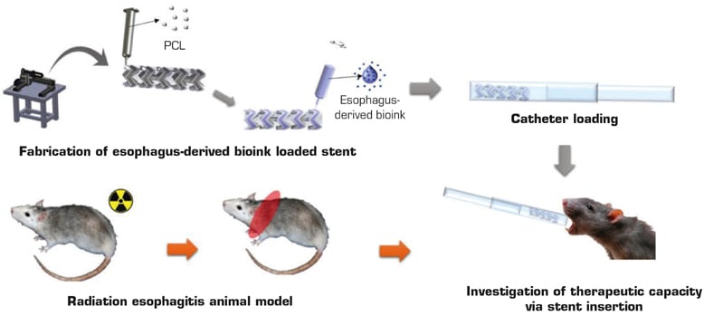 The research findings were recently published in Biomaterials, an academic journal with international authority in the biomaterials field.1 According to the paper, “Through the delivery of the hydrogel with stent platform, we aimed to evaluate the regenerative capacity of a tissue-specific decellularized extracellular matrix (dECM) hydrogel on damaged tissues. For this, an esophagus-derived dECM (EdECM) was developed and shown to have superior biofunctionality and rheological properties, as well as physical stability, potentially providing a better microenvironment for tissue development. An EdECM hydrogel-loaded stent was sequentially fabricated using a rotating rod combined 3D printing system that showed structural stability and protected a loaded hydrogel during delivery. Finally, following stent implantation, the therapeutic effect of EdECM was examined in a radiation esophagitis rat model.”