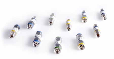 Delta Electronics, Beverly, MA, has introduced a line of color-coded adapters designed to work with coaxial connectors operating across frequency ranges from DC to 110 GHz. The adapters mate different combinations of male (plugs) and female (jacks) coaxial connectors at microwave through millimeter-wave frequencies for measurement setups that require regular interconnections between a device under test (DUT) and the test equipment. The adapters fit different combinations of 2.92-mm connectors (DC to 40 GHz), 2.40-mm connectors (DC to 50 GHz), 1.85-mm connectors (DC to 65 GHz), and 1.00-mm connector interfaces (DC to 110 GHz).