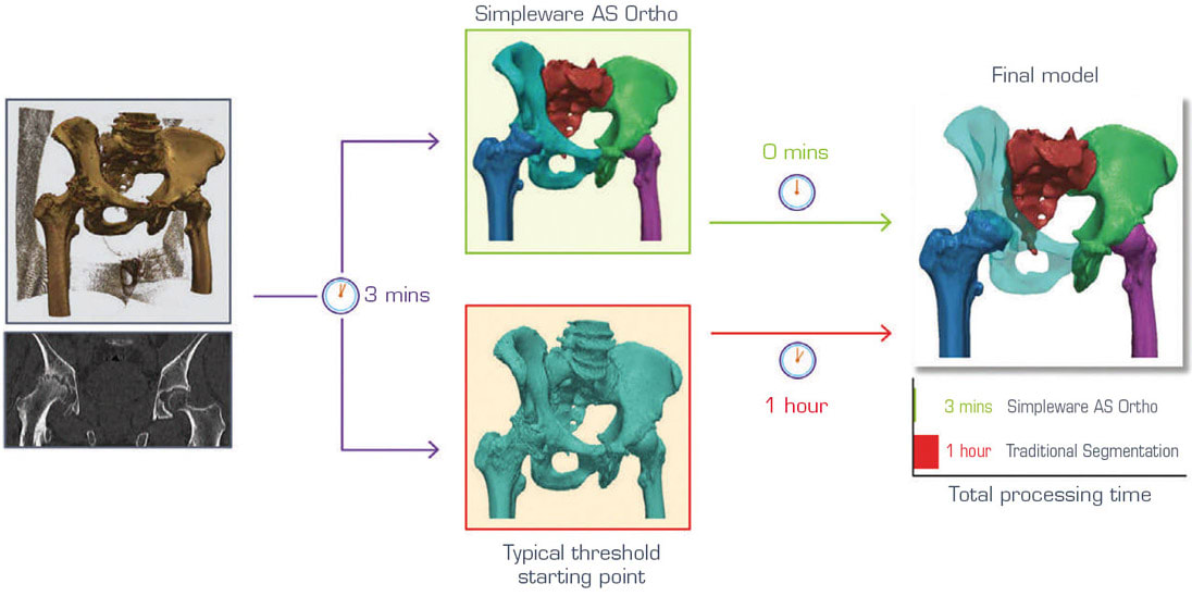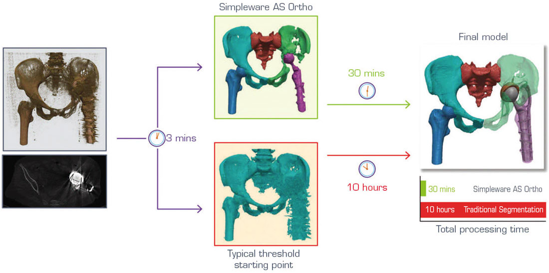 Automated Segmentation for Different Revision Cases. AI is becoming increasingly recognized in the medical field when dealing with these repetitive challenges, for clinical detection and patient-specific surgical planning or design purposes. Synopsys Simpleware™ software is one example of where AI has been applied to a specific problem in manual segmentation, and uses machine learning to automate repetitive steps and landmarking in order to speed up workflows (see Figure 1). Patient datasets and extensive training inputs are used to develop algorithms that can, with a single click, automate a large part of the segmentation on an anatomy, with clinical reviews used to ensure suitability for real-world cases. This technology has been applied through Simpleware AS Ortho, a software module that works specifically with hips, knees, and ankles.