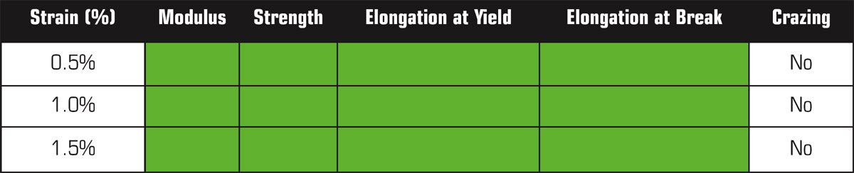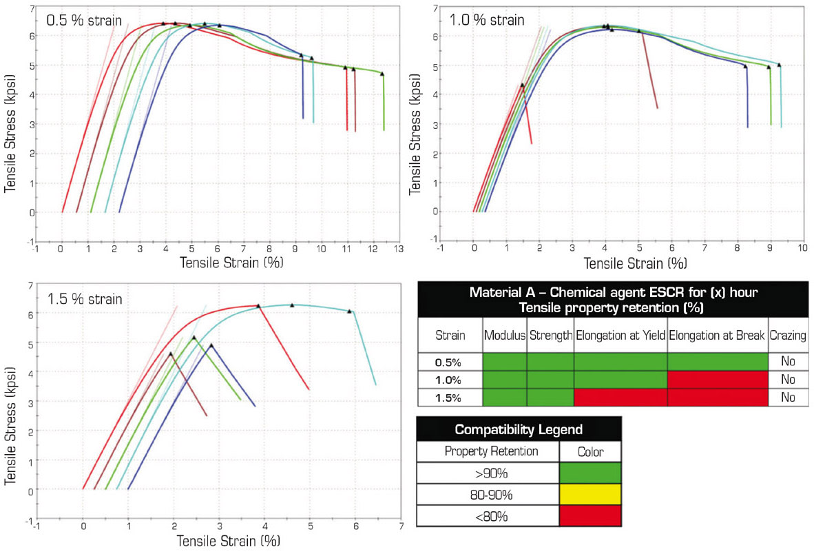 A unanimous parameter(s) (modulus, strength, elongation at yield, and break elongation) should be published for ranking the compatibility matrix against chemicals tested in line with the geared application. Tensile strength and elongation at yield present closer relevance to materials deformation behavior under mechanical loads in use. 7Elongation at break measures the materials failure stress but often is misleading and shows the most scatter across the tested pool of tensile bars as shown in Figure 4. In addition, visual observations linked to onset and development of crazing or stress whitening of material during exposure should be recorded (see Tables 1a and 1b). Figure 4 and Tables 1a and 1b present the twofold scenario expressing ESCR output.