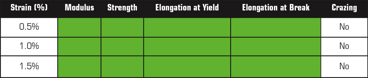 Interestingly, the material shows tensile property retention ≥95 percent, specifically tensile strength, modulus, and elongation at yield, after exposure to IPA for 5 hours at all strain levels (see Table 2). Certainly, the high performance is a direct function of the composition and the careful formulation of components that present a compatibilized blend. It is essential to understand that the preconditioning enables sufficient segmental motion during annealing to potentially eliminate any residual molding stresses and offer a homogenous part with representative properties, hence yielding a ductile, toughened, and IPA-resistant material.