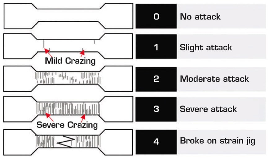 Leading resin manufacturers offer products designed for ESCR applications in medical devices. They support performance metrics to quantify chemical resistance and cross reference material endurance with chemical agents.2-6 These compatibility matrices are insightful in understanding their material specific performance but could be highly subjective when screening through industry-wide choices. Foremost, the test methods to quantify compatibility against a chemical agent show disconnect and widespread practices across suppliers. Therefore, the medical device industry should combine input from resin producers, medical device manufacturers, and the application environment to define a regulated approach for measuring ESCR and corroborating material comparisons. As a result, the different resin solutions available for a given application would be assessed through the same metrics and ranked for performance/resistance against these chemicals. Key aspects to consider for universal harmonization and evaluating ESCR are discussed below.