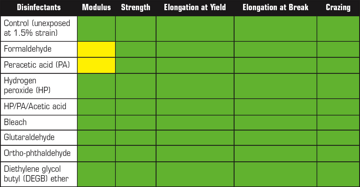 This test was conducted using Wet Patch Method (ASTM D543 - 14). Standard type 1 ASTM tensile testing specimens were mounted to strain jigs designed to apply a predetermined amount of strain onto the specimens. A saturated cotton patch (such as sterile gauze) was draped over them such that test specimen is in direct contact with the disinfectant reagent being tested. The length of exposure was 24 hours at room temperature. Three sets of measurement data were taken; a set of specimens (five replicates) under no strain and no reagent applied, strain and no reagent, and strain and each disinfectant reagent.