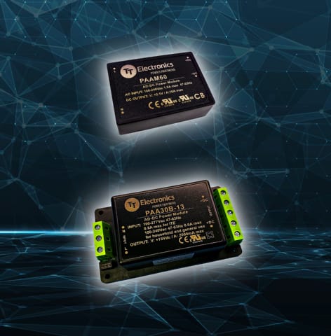 TT Electronics, Woking, UK, has launched compact AC-DC encapsulated power modules. The PAA and PAAM series is ideal for space-constrained medical electronic equipment applications. Available in power ratings ranging from 5 to 150 W, the PAA modules are PCB mountable in a compact footprint starting at 1.1 × 1.5 in. (8.05 W/in³). A 4 kVac input-to-output isolation provides safety when interfacing with downstream SELV networks. The modules provide conversion efficiencies of up to 89 percent and are free air convection cooled to improve end system reliability and reduce energy waste. PAAM encapsulated power modules are available in power ratings from 15 to 150 W.