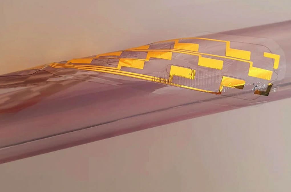 Their finished device is just 60 μm thick — thin enough that it can be rolled up and placed in a needle for implantation. However, after implantation, the device expands out to cover a wide area of the spinal cord, thanks to the microfluidic channels.