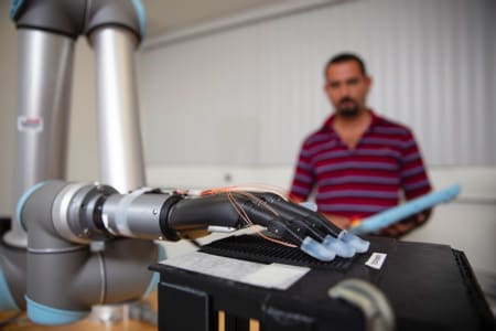 Results showed that the integration of tactile information from liquid metal sensors on four prosthetic hand fingertips simultaneously distinguished between complex, multi-textured surfaces. The algorithms distinguished between all the speeds with each finger with high accuracy. This new technology could improve the control of prosthetic hands and provide haptic feedback for amputees to reconnect a previously severed sense of touch.