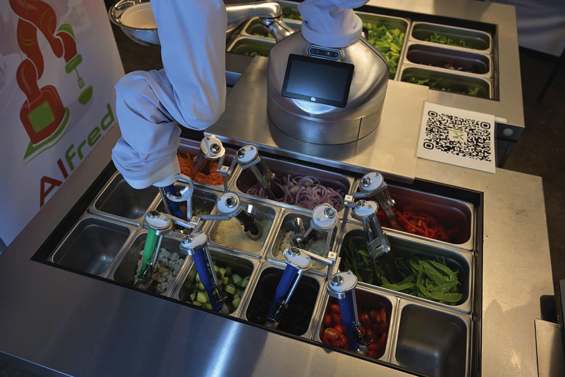 The unit is part of a trend in the food service industry toward the use of more automation. The design includes a robot, two areas to hold tools, a kitchen display system, bowl passing arm, an enclosure for electronics, and two refrigeration units.