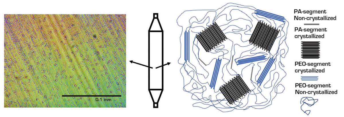 In the extrusion process, materials are melted and then enter a water bath where they crystallize and form a morphology. The morphology and orientation within each tube determines the physical and mechanical properties. The Pebax as is a copolymer of nylon 12 (PA) and polyether (PEO). The morphology of the Pebax balloon surface was recorded using polarized optical microscopy (see Figure 2). The extruded tube is expanded axially and radially (blow molding) to form the balloon. One of the effects of the expansion is the orientation of the polymer, which improves mechanical strength. Tensile tests in the axial direction were performed on the tubes and the balloons (see Figure 3).