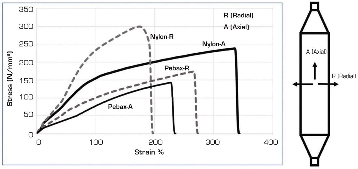 The other noticeable change is the yielding behavior of nylon 12, which disappears upon stretching. To evaluate the tensile strength of the balloons in axial and radial directions, a rectangular sample was cut from the balloons, and tensile tests were performed along axial and radial directions (see Figure 4). The balloon is stronger overall in radial direction when compared to the axial direction. This is more pronounced for nylon than Pebax balloon, which is advantageous for biomedical applications because radial burst increases risk of difficulty in removal and is therefore considered a higher risk failure mode compared to longitudinal burst. The tensile behavior is less sensitive to direction for Pebax balloons. This is likely a result of the presence of soft segments that reduce the effect of crystallinity and normalize crystal orientation for the Pebax balloon. Both the flexibility and stiffness of balloons are important in their applications.