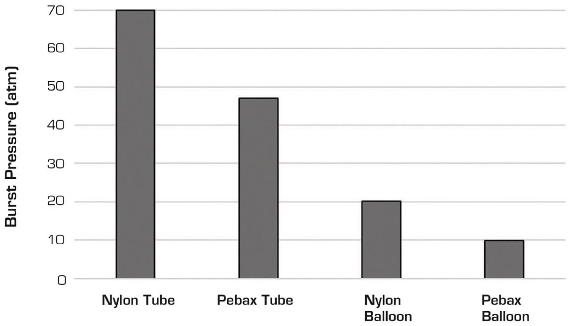 Nylon tubes with a wall thickness of 0.355 mm passed the maximum capacity of the burst pressure machine. The lower burst pressure for Pebax tubes is likely due to the presence of soft segments. This contributes more to compliance rather than strength.