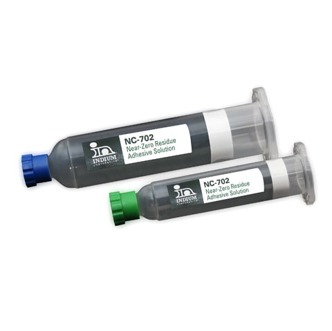 A no-clean, near-zero residue, halogen-free adhesive solution designed for holding parts in place during placement and reflow processes is available from Indium, Clinton, NY. Designed for use in a formic acid reflow environment, NC-702 is specially formulated with high tack to hold a die, chip, or solder preform in place without movement, creating a tooling-free solution. While the adhesive has the tack strength to hold materials in place, the material completely evaporates out during reflow, eliminating the time-consuming post-reflow residue cleaning steps.