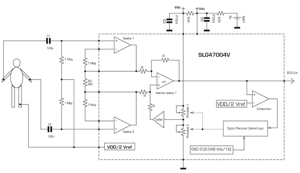The SLG47004 can be used as a cost-effective integrated solution for the analog front-end of an ECG monitor. Its unique auto-trim feature allows it to cancel system offset as well as provide steady output. The embedded instrumentation amplifier provides a good common-mode interference rejection, the magnitude of which is much bigger than the signal itself.