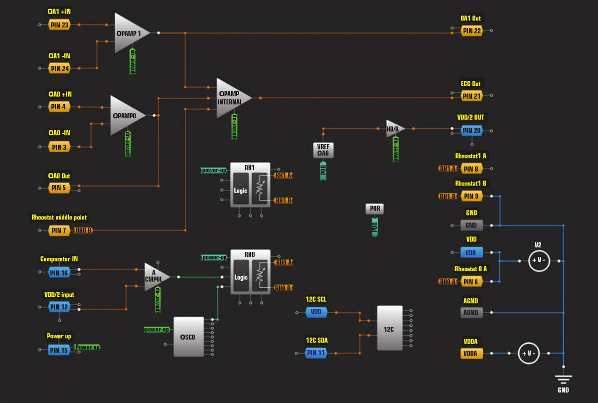 A simplified structural scheme of the top of the analog front-end is shown in Figure 1. A typical electric signal from a heart, picked up by the electrodes on the arms, is shown in Figure 2. The typical ECG waveform has five peaks called P-Q-R-S-T. These peaks correspond to the activity of different parts of the heart. The proposed design configuration is shown in Figure 3. It was created in the GreenPAK™ designer software. The complete design file can be found on the Dialog Semiconductor website. 1