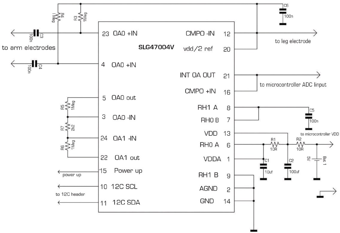 It details the integration of SLG47004, a fully programmable advanced analog system IC. The SLG47004 AnalogPAK can deliver only one instrumentation amplifier, so this example uses AC filtering on the digital side. A simple DC reference point is used for a leg electrode without active interference cancelation.