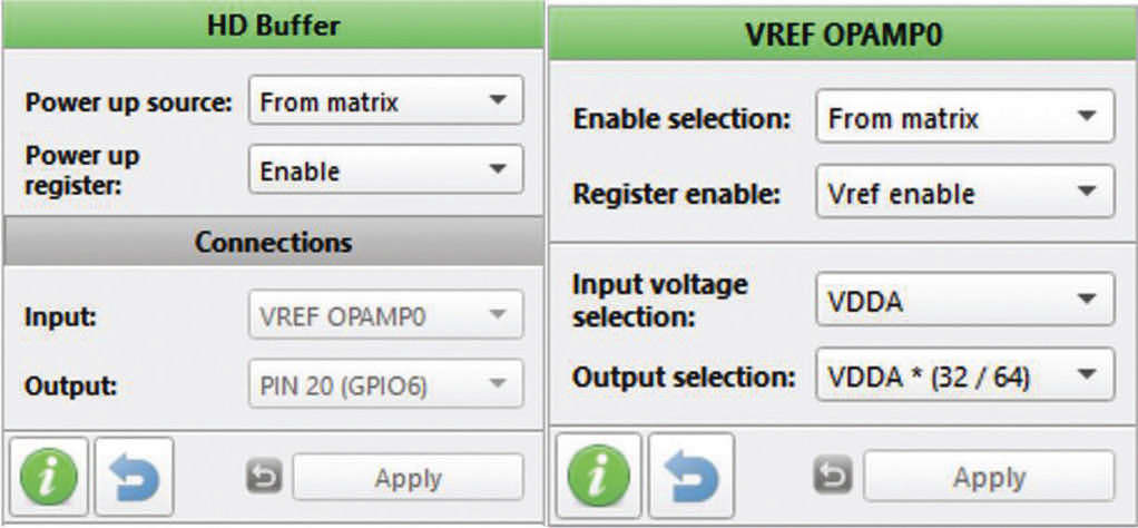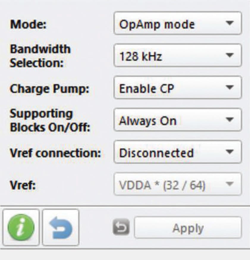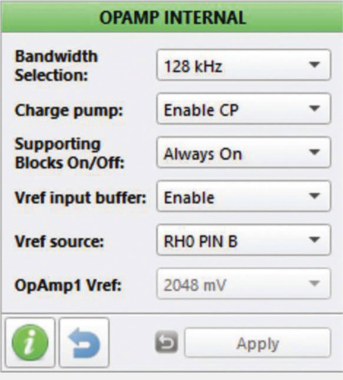 The electrical schematic of the analog front-end is shown in Figure 4. OpAmp0 and 1 use the same configuration, shown in Figure 5. The internal OpAmp configuration is shown in Figure 6, and the HD buffer shares the voltage reference with OpAmp0. In the current project, the internal V ref is disconnected from OpAmp0. The HD buffer and OpAmp0 Vref configurations are shown in Figure 7.