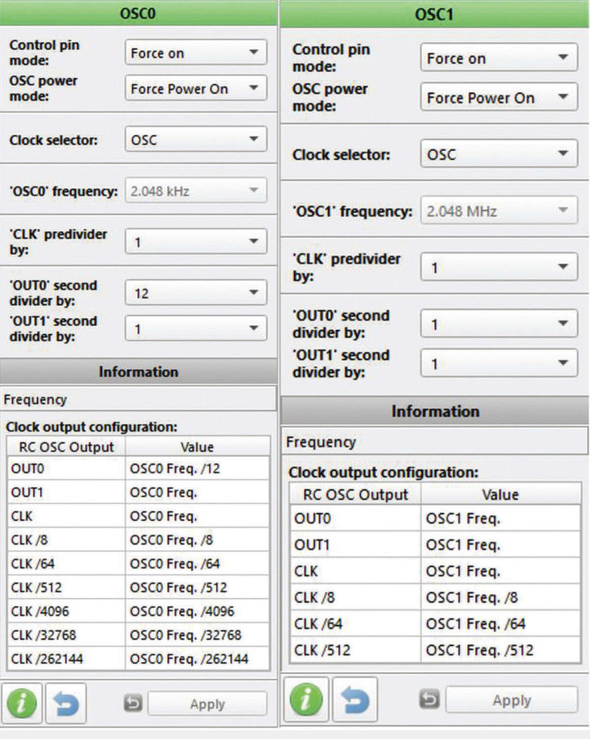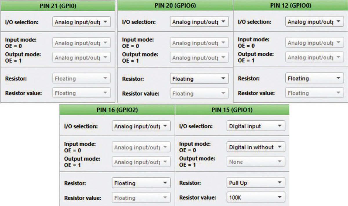 The rheostat in this project is configured as a digital potentiometer. Its configuration is shown in Figure 8. The configurations of oscillators 0 and 1 are shown in Figure 9. The I2C macrocell uses default configurations, and the general-purpose input/output (GPIO) pins 17, 18, 19, 10, and 11 have the default configuration. The remaining GPIO configurations are shown in Figure 10.
