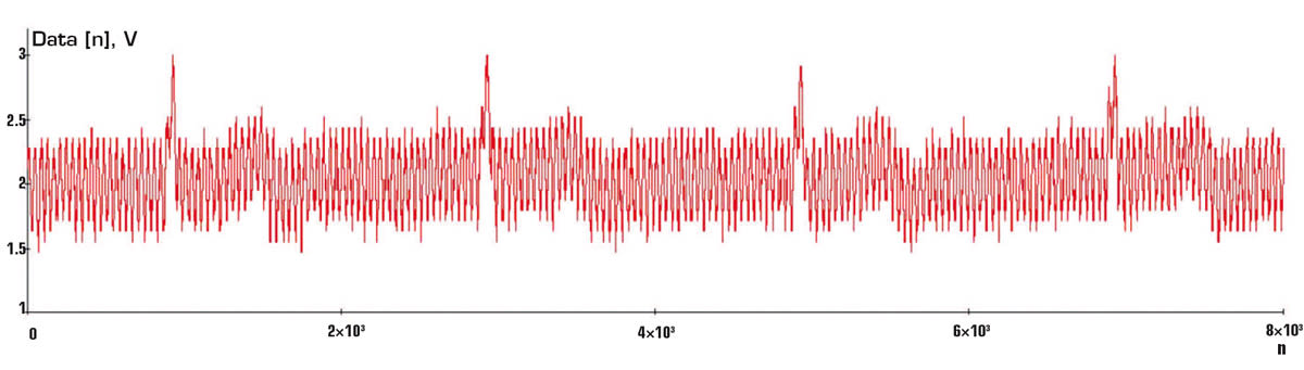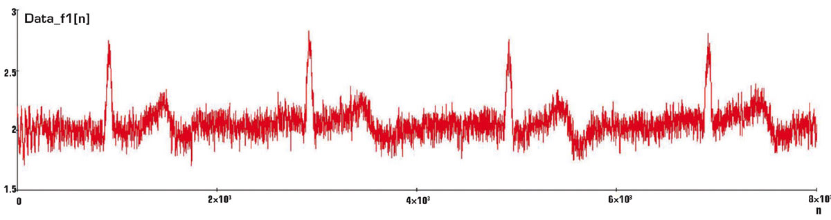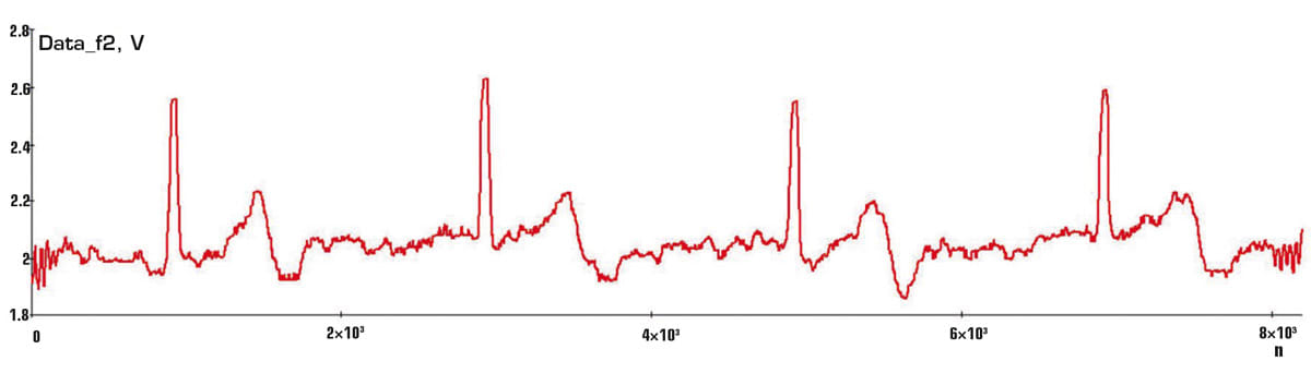 The common approach is to apply digital filters to remove power grid noise as well as other noise components 2. 2 Many articles describe and compare different digital filtering approaches. 2, 3 Since the purpose of this discussion is to show the performance of the analog front-end, this article skips the digital filter synthesis procedure and shows the filtered signal. Figure 13 depicts the raw digitized signal. At the first filtering stage, 50 Hz noise was removed (see Figure 14). At the second filtering stage, a median filter was applied to the signal (see Figure 15). 6, 7
