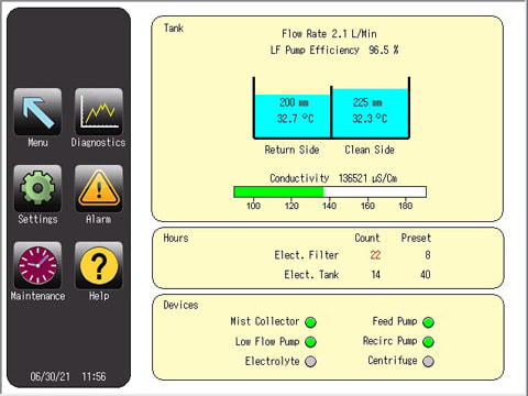 Glebar, Pennsauken, NJ, has developed an enhanced electrolyte tank featuring digital ultrasonic sensors that feed data to the HMI screen through an I/O link, enabling better grind management, improved grind efficiency, and reduced downtime. The upgraded tank provides customers with an easier and more reliable way to check the electrolyte levels of Tridex electrochemical cutoff and grinding machines. An I/O link connects digital ultrasonic sensors to the HMI screen, which generates a graphical and numerical display of the electrolyte health and fill levels. Alerts generated by the HMI allow operators to quickly make changes.